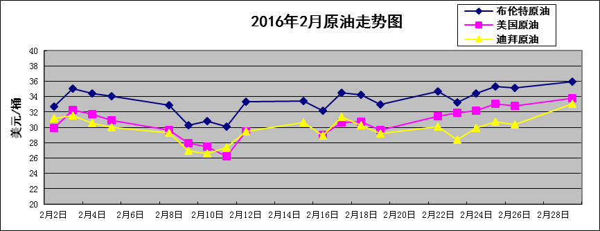 2016年2月世界各地原油價格呈先抑后揚態勢,受供給過剩的影響,2月上旬原油價格延續跌勢并在2月11日前后跌至本月低點,美國原油期貨甚至再次跌破十二年低點