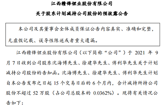 昨日晚間,贛鋒鋰業公告,于2021年9月7日收到公司股東沈海博、徐建華、傅利華關于計劃減持公司股份的告知函。沈海博、徐建華、傅利華計劃自本公告發布之日起15個交易日后的6個月內,合計減持所持公司股份不超過52萬股(占公司總股本的0.0362%)。